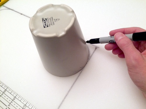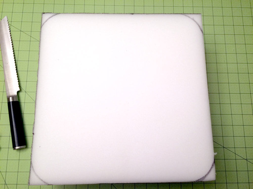 - On the foam, draw a 12½” x 12½” square with rounded corners. Draw the square first with your ruler. A coffee mug or similar works well to round each corner.