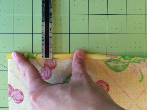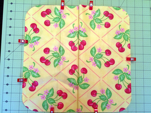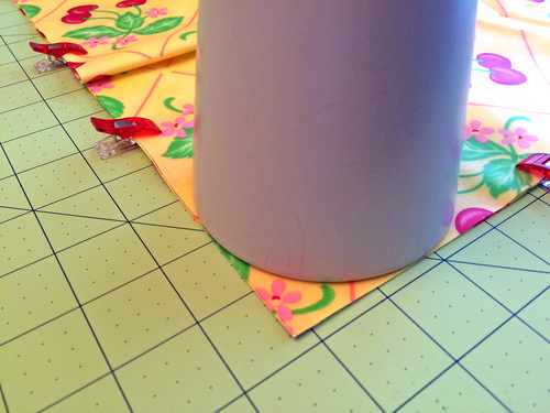 NOTE: If you are new to working with multiple layers, before rounding, you may want to make a small seam just across the overlap at the very top and very bottom of the overlapped back panels (you are not stitching through the top panel; this is just to anchor the two back panels). Stitch as close to the raw edges as possible. These short seams simply anchor the two pieces together, allowing you to work with the back as one piece rather than two through the rest of the project. - As you did above for the foam block, use a mug or similar to draw in the curve of each corner.