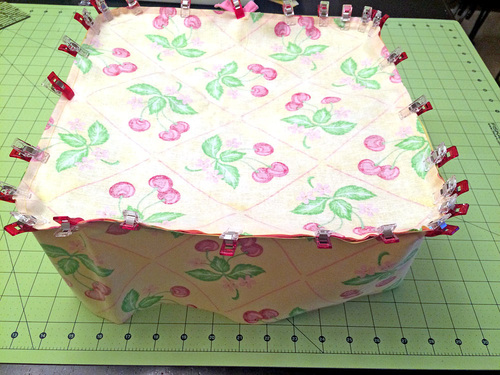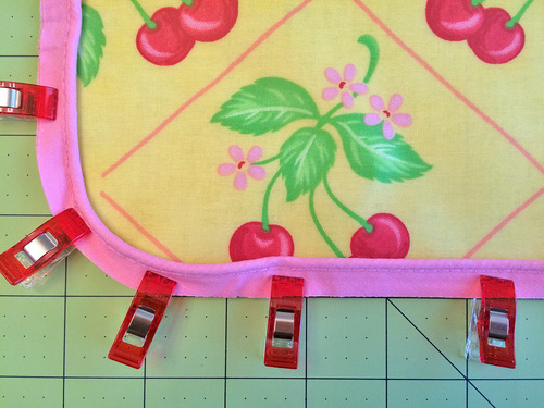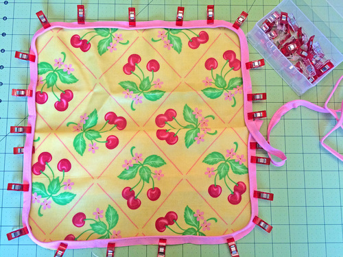 NOTE: We used two packages to insure we could easily work with one, continuous length of piping around each panel. - Place the bottom overlapped panels right side up and flat on your work surface. Starting at the center of the top overlap (this will become the back of the booster seat), place a length of piping around all four sides of the panel, clipping in place as you go. We used our Wonder Clips. Leave about 1″ free at the head and the tail of the piping.