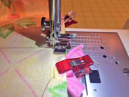 NOTE: We did not find it necessary for this project, but you can snip into the piping at the corner to allow a smoother curve. Just cut into the raw edges; do not cut through the seam line into the piping itself. - Attach a Zipper foot.