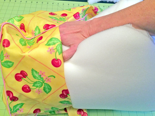 - Insert the foam block into place through the back envelope opening. It’s a tight fit, as it should be, but the foam is also squishy. You can easily work it through the the opening and then fluff it out into the corners of the cover.