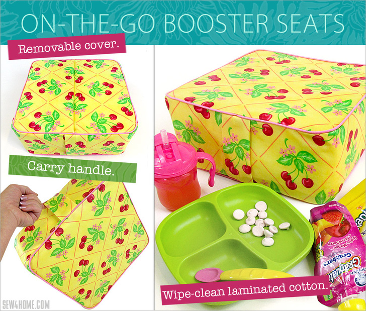 Booster chairs are pretty familiar in restaurants, but are not necessarily commonplace. And if you and your kids like to visit friends and family who don’t have children at home, you’re unlikely to have many options other than the classic phone book to boost your child to table height. But wait a minute… who still has a big phone book?!! It’s easy to make your own portable booster seat in cute, wipe-clean oilcloth or laminated cotton with a sturdy yet lightweight foam core.