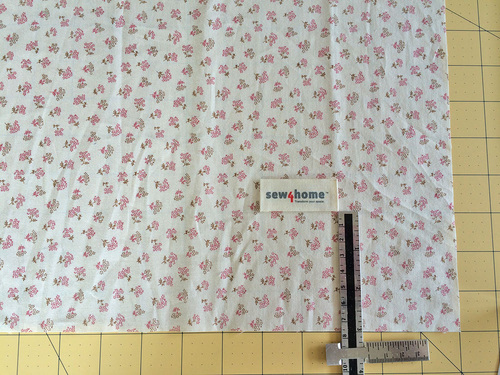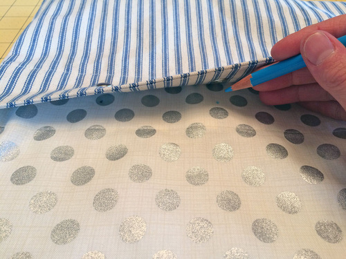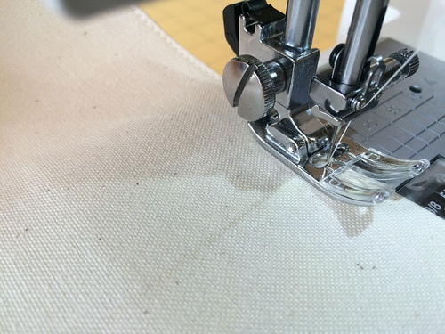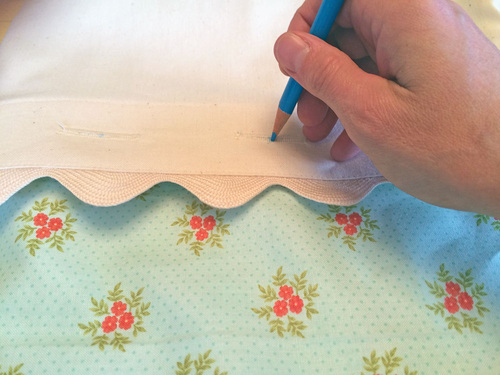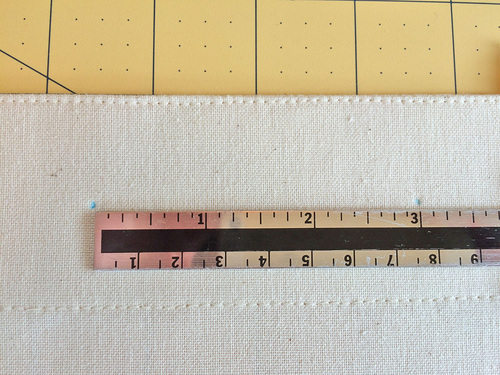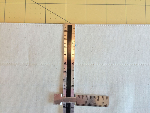- Find the exact center of the panel (6½” in from either raw edge). Place the first mark at this point, centering it between to two lines of stitching.