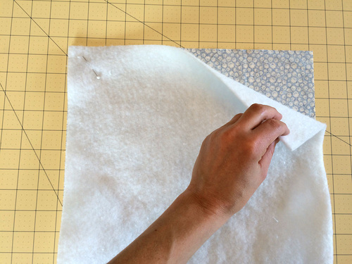 - Layer a square of batting against the wrong side of each pillow front square. All edges of both layers should be flush. This is optional, but provides a nice, smooth finish.