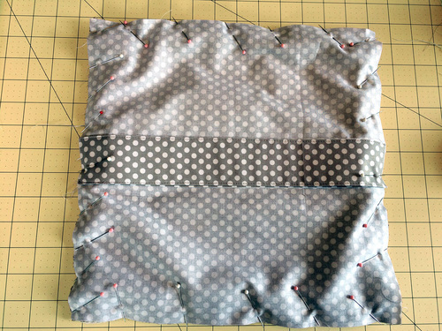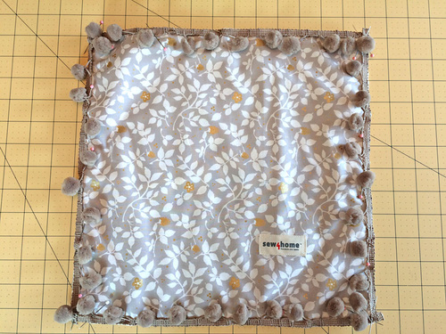 - Repeat for each side and pin all four lengths in place. The edge of the trim’s insertion tape should be flush with the raw edge of the pillow front.