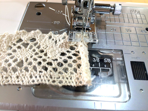 - For the lace trim, first make a narrow rolled hem at each end of your 72″ length.