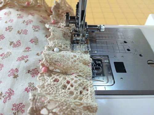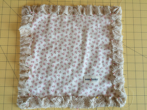 - Starting at the center bottom, pin the lace against the right side of the pillow front. Overlap the ends about 1″ at the center bottom.