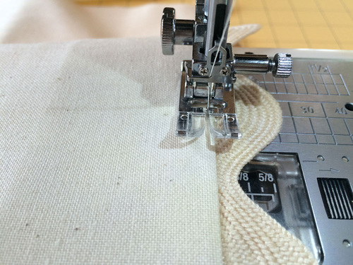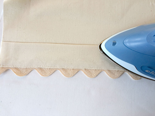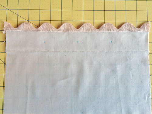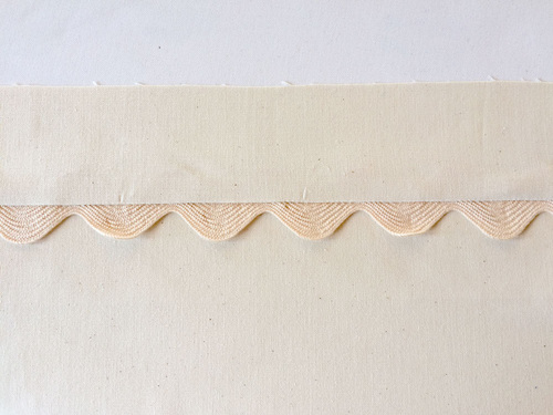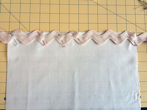 - If using a envelope opening trim, add it now. The trim goes along the interfaced edge. Position it so the correct amount of trim will be visible from the sewn facing seam. For example, with our wide rick rack, this meant we positioned the center of the rick rack ½” from the raw edge of the panel. This allowed exactly half of the rick rack to extend beyond the ½” sewn seam of the facing. Pin the trim in place.
