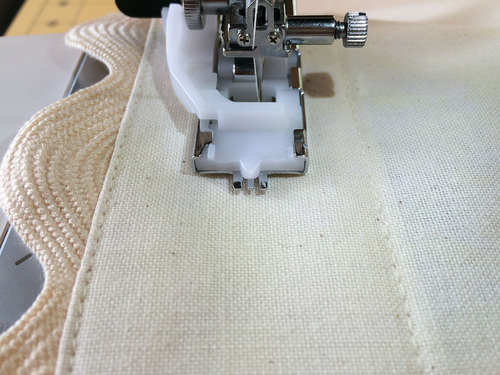 - Using a ½” seam allowance, stitch in place. Press the facing away from the trim, then around to the back of the panel so the facing and the panel are wrong sides together (the photo below shows just the first step of pressing the facing out from the trim).