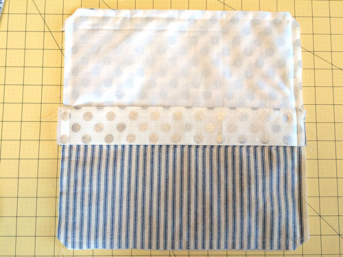 - Place the back top/underlap panel right sides together against the top of the pillow front, overlapping the bottom panel and aligning the raw edges along the top and sides. Pin in place. As shown below, if you used an edge trim it should be neatly sandwiched between the front and back panels – out of the way of the seam line.