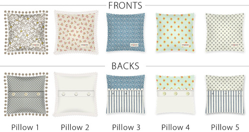 We mixed quilting weight and mid-weight fabrics for our five-pillow set. Our goal was a neutral color palette with smaller, soft motifs. We wanted the pillows to look as if they’d been around awhile – perhaps soaking up the sun in a cozy window seat.