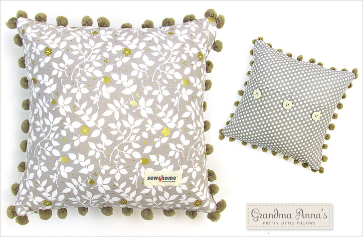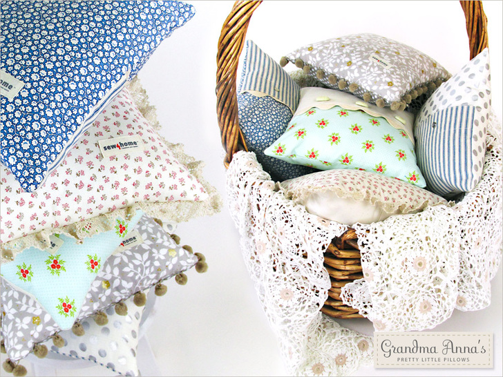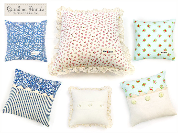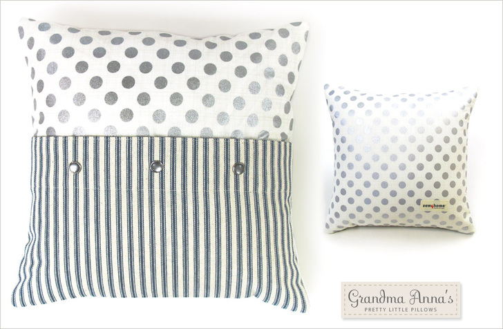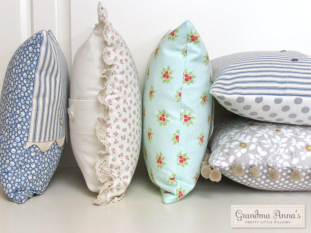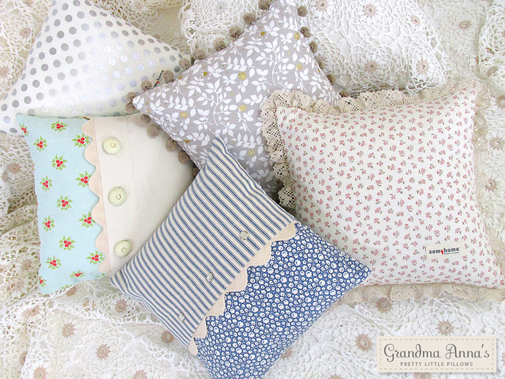 Our Grandma Anna was a waste-not-want-not kind of gal. In her tidy bungalow was a narrow closet she used to store her sewing supplies. It didn’t contain much in the way of pristine yardage and packaged notions, but she still had plenty to work with – each item carefully organized into a small paper sack or recycled tin can. She would cut the “still good” parts from well-worn clothing, squirrel away every fabric scrap, snip off buttons, and hoard embroidery floss in lengths as short as 6″. The amazing thing was how she could take these cast-off bits and pieces and turn them into something so very sweet and pretty. We’re taking a page from Grandma’s book with our set of five little mix-and-match pillows in natural tones and textures.