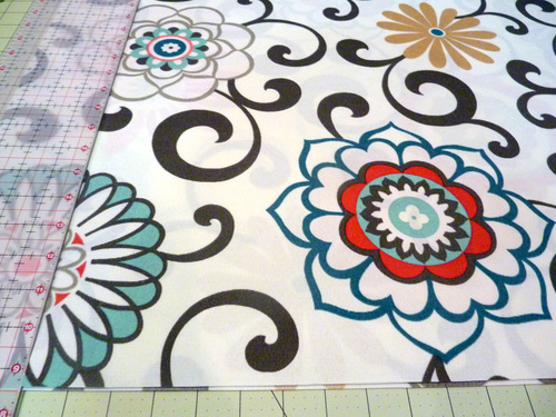 - From the fabric for the inside back panel (Pom Pom Play Peachtini in our sample), cut FOUR 20″ wide x 23″ high rectangles. We fussy cut our panels to best feature the motifs on the fabric since these are the panels that are most prominent.