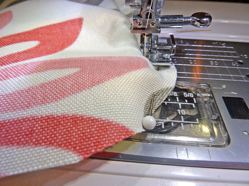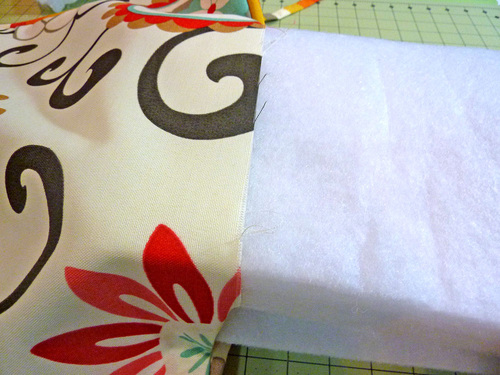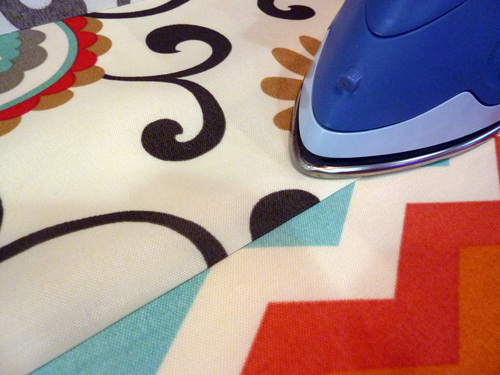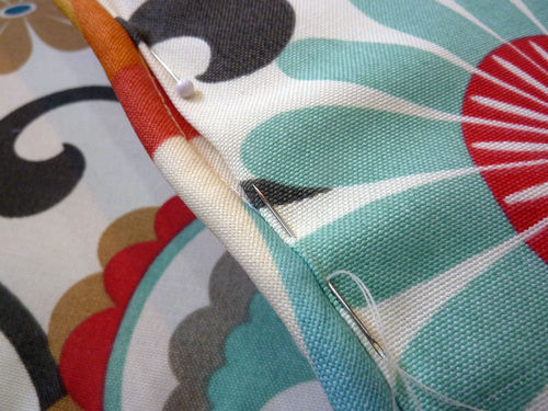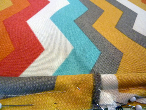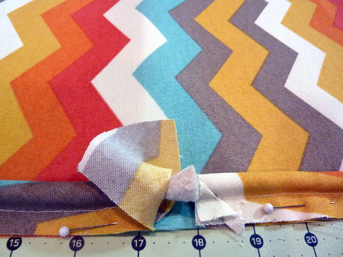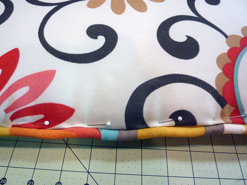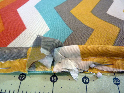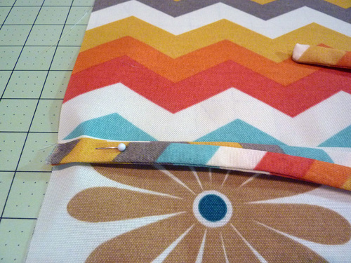 - Fold down the raw edge of the top inside panel so it is flush with the sewn seam, and pin in place up against the piping.