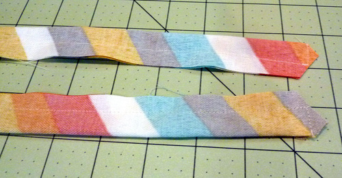 - Fold each strip in half lengthwise, right sides together, aligning the raw edges. Pin in place down the long side and across one end. Leave the opposite end open.