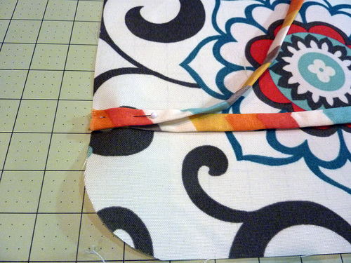 - Place the finished inside and outside panels right sides together, aligning the rounded corners and all the raw edges, and sandwiching the piping between the layers.