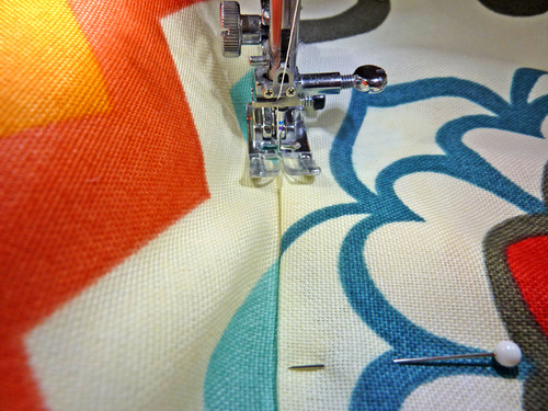 - Re-thread your machine, if necessary, with thread to best match the cushion (from both sides). We used natural in the top and orange in the bobbin.