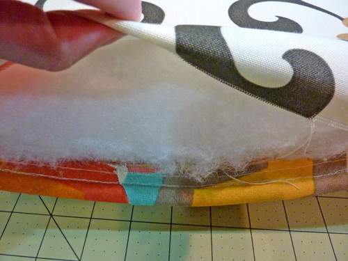 - Before inserting the foam, fully machine stitch the piping in place across the top opening against the back panel. Remember, it was only machine basted in the prior steps. It has been secured into the seam around the rest of the cover, but not across the top opening. You want it to be secure prior to hand-stitching the opening closed, so stitch across with a ½” seam allowance to match your sewn seam, staying right up against the cord. Now, when you hand sew the top shut, this section of piping will be at the ½” seam allowance just like the rest of the seam.