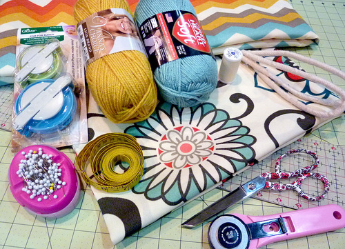 - TWO skeins of polyester yarn, in two coordinating colors, for the optional pom poms; we used dark yellow and turquoise, purchased locally