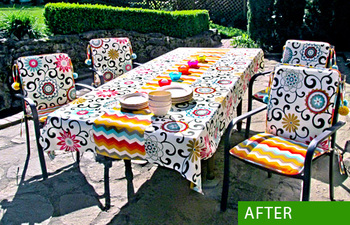 After wrapping the patio set in the vibrant colors and patterns of beautiful outdoor fabrics, we’re ready for a casual gathering in sizzling style.