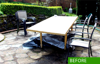 Our Pacific Northwest winters are known for their constant rain, wind, and snow. After the storms have passed, dragging away the protective tarps can be rather discouraging when you discover the punishment your outdoor furniture has endured. That’s where beautiful fabrics come in! Our sample patio still sported its winter grays when we first started measuring and dreaming. A bonafide “before” challenge with a wonderful “after” effect.