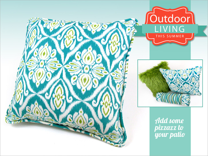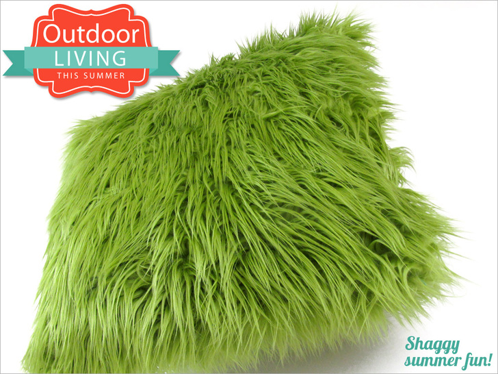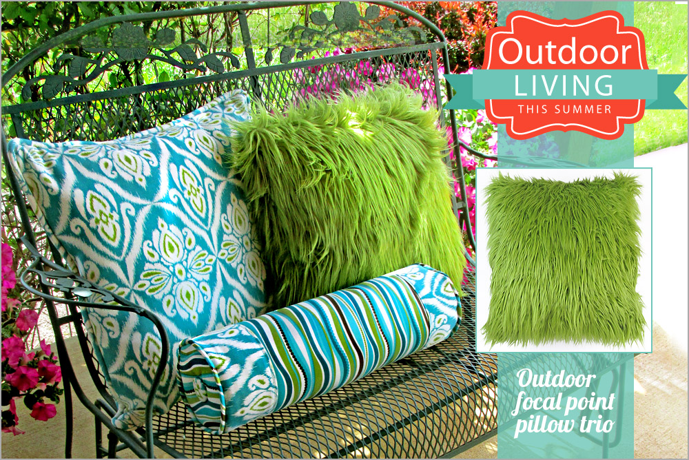 If you need to instantly perk-up your outdoor living space, nothing is faster or easier than a set of pretty pillows. The focal pillow in our patio trio uses faux fur. Faux fur for summer? Yep! We chose a great shaggy fur that looks like a pillow made of fresh green grass. It’s paired with a classic piped square and a tufted bolster. Both of these are in a tough indoor/outdoor fabric.