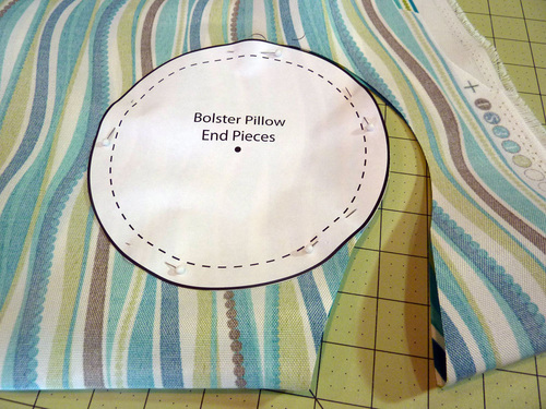 NOTE: If you are new to cutting on the bias for piping, we have a great tutorial: How to Make and Attach Piping for Pillows & More. - Using the Bolster End pattern, fussy cut TWO circles