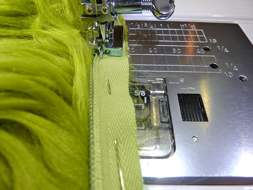 - The only extra step when doing a zipper insertion in faux fur is to comb the fur away from the raw edge of the fabric so you don’t have little hairs in the way of the zipper tape when sewing.