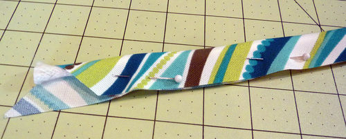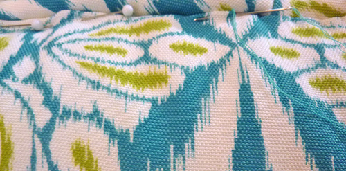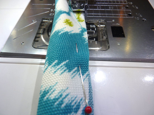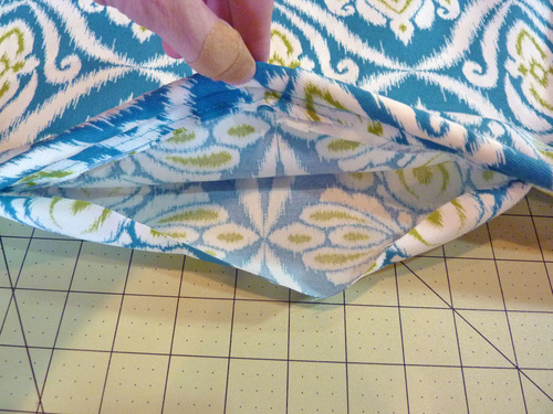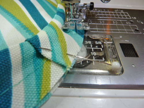 - Fold in the raw edge at the opening so it is flush with the sewn seam and up against the piping. Lightly pin in place.
