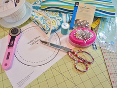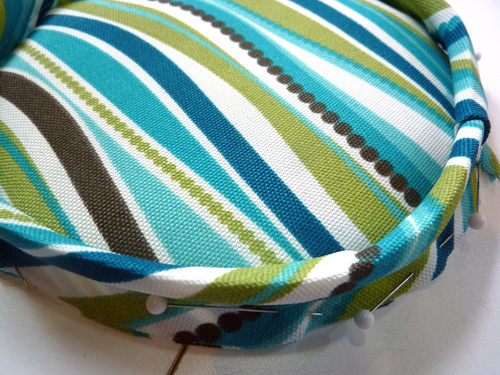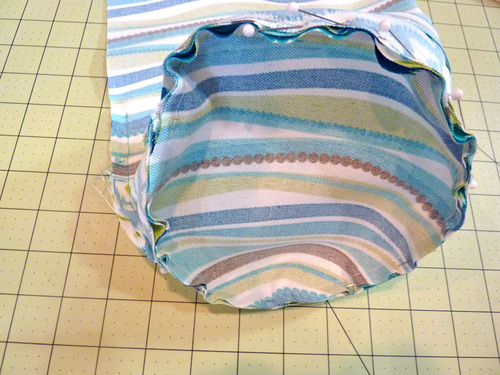 - Pin piping to the right side of the bolster end panel, aligning the raw edges of the piping with the raw edge of the circle.