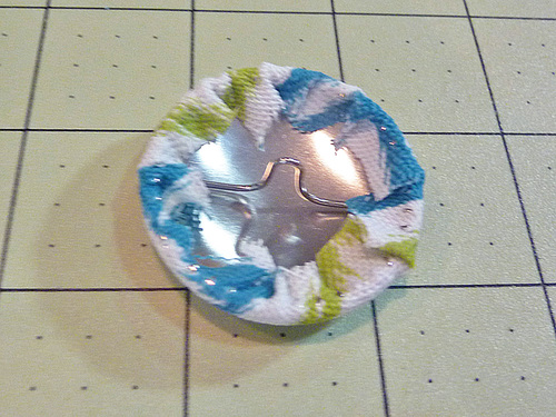 - Run the waxed button thread through the shank of one covered button, doubling the length. Make sure you have plenty of thread; you need it to be at least a few inches longer than the bolster itself – then double this because you are threading a double length. It’s better to have more thread than not enough.