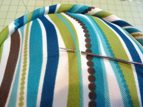 - As it begins to disappear, “accordion” the cushion to continue moving the needle down through the center of the foam until it comes out the opposite end. Maneuver the point of the needle as necessary to insure it comes out through the exact center mark on the bottom of the cushion. Once you’ve made it out the center, pull the needle all the way through.