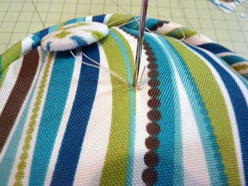 - Remove the thread tails from the needle, keeping some tension on the thread as you pull it away from the pillow. Pull apart the two lengths of thread. Thread one length through the remaining covered button. Tie the ends into a slip knot.