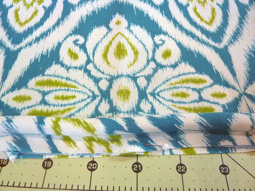 - 1¼ yards of 45″+ wide indoor/outdoor fabric; we originally used 54″ Jaipur from Terrasol Indoor/Outdoor in Peacock