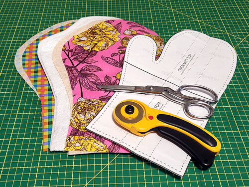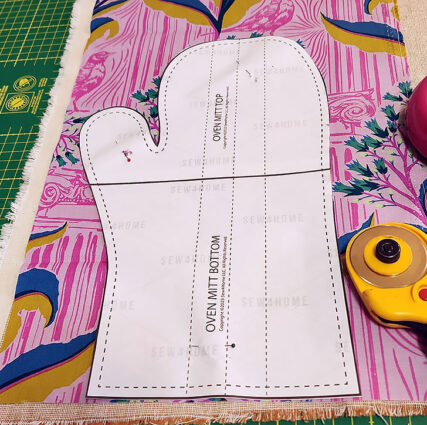 NOTE: You can layer the mitt front and mitt back WRONG sides together, place the paper pattern on top, also right side up, and wild cut both layers at once. With the fabric layers wrong sides together, you insure your “thumbs” will match up to the lining front and back. Don’t forget to center a pretty motif for the mitt front.
