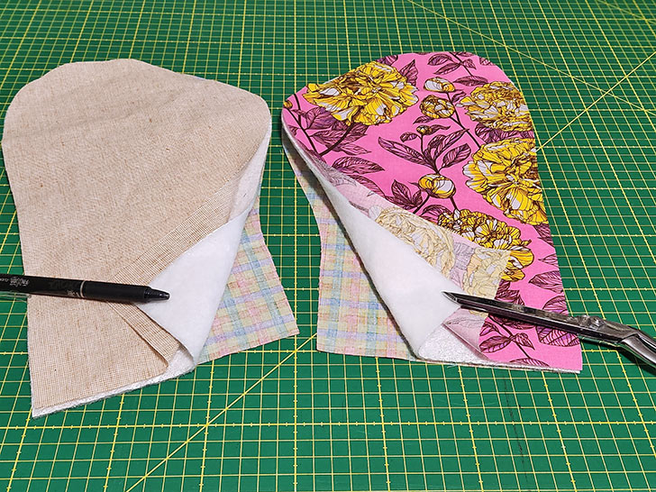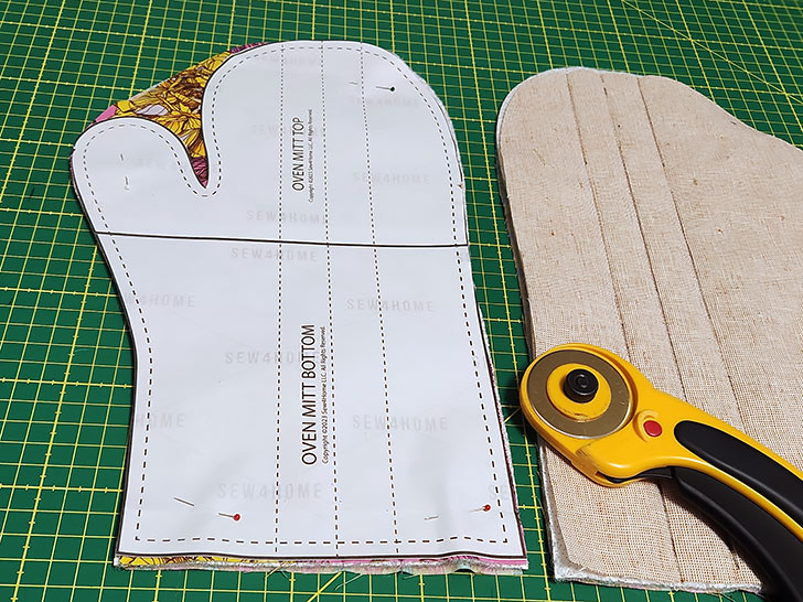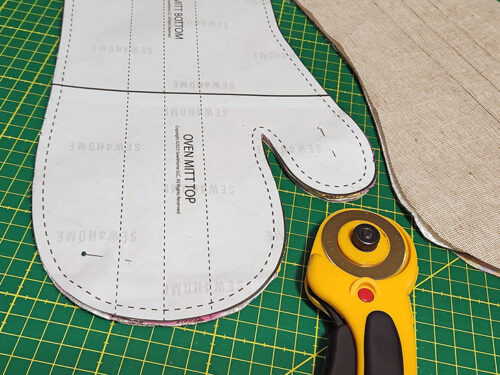 NOTE: Because the front and back of the mitt are quilted, we recommend a bit of a “wild” cut at this point. As shown in the photos below, follow the cut line of the pattern along the top, sides, and bottom, but across the thumb area, do a rounded-off or blunt cut – do not cut down into the curve of the thumb. You will re-cut this section after the quilting is complete. This allows for a more accurate cut within the narrow section of the curve.