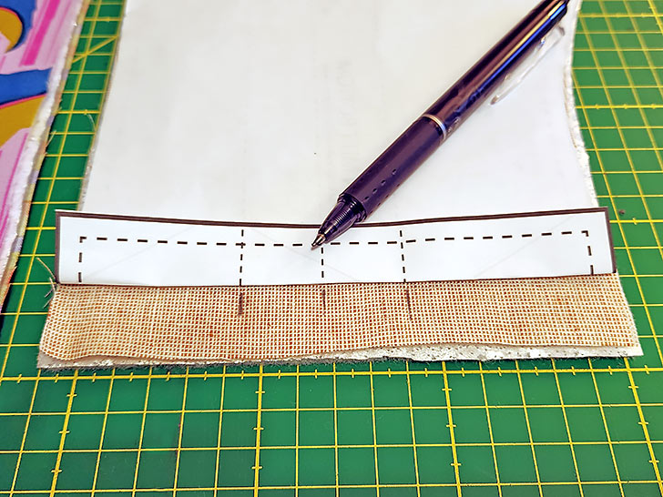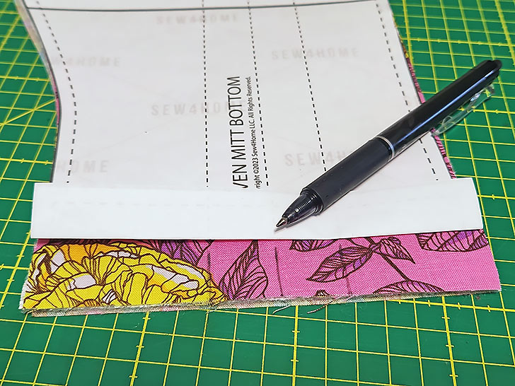 - Place the paper pattern over the front sandwich and mark the position of the three quilting lines at the top and bottom of the mitt.