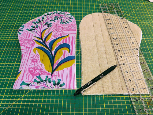 - From the fabric for the mitt front, use the pattern to “wild cut” ONE. Take the time to center a prominent motif for the best finished look.