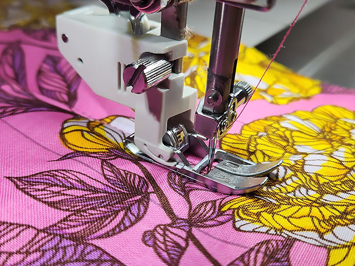 - Set up your machine for quilting. We started with our front sandwich. Thread with a color to best match the front exterior panel in the top and best match the lining panel in the bobbin. Slightly lengthen the stitch. Attach an Even Feed/Walking foot or – as we did with our Janome AcuFeed™ Flex system – engage your machine’s built-in fabric feeding system. We used the AcuFeed Narrow VD foot.