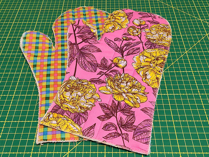We indicate a single layer of thermal batting against the front and back of the oven mitt. This is our traditional choice, but you could certainly add another layer. Just remember you might need to adjust the size of the cuff binding loop and could have a challenge maneuvering the tight curve in the mitt’s thumb area.