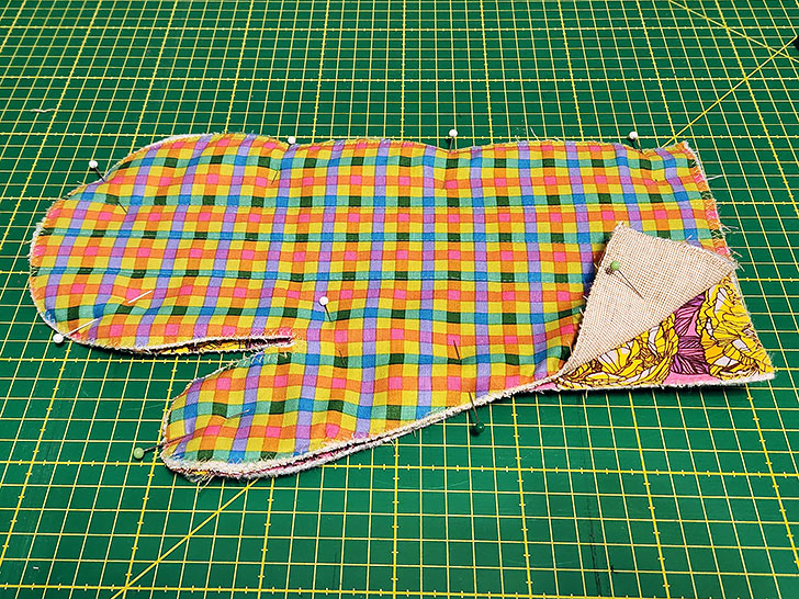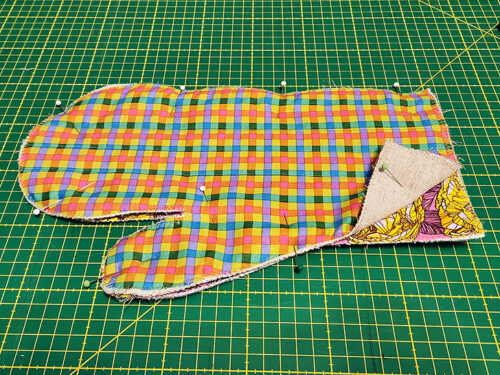 - Place the front and back quilted sandwiches right sides together and pin all around, leaving the bottom cuff edge open… yep, that’s where your hand goes; don’t want to sew that closed!
