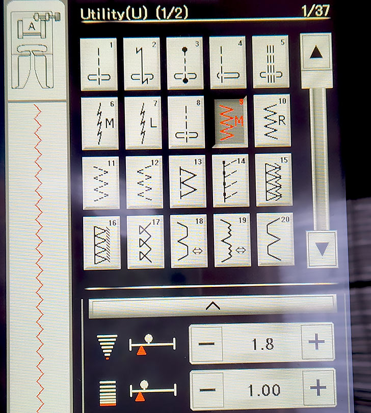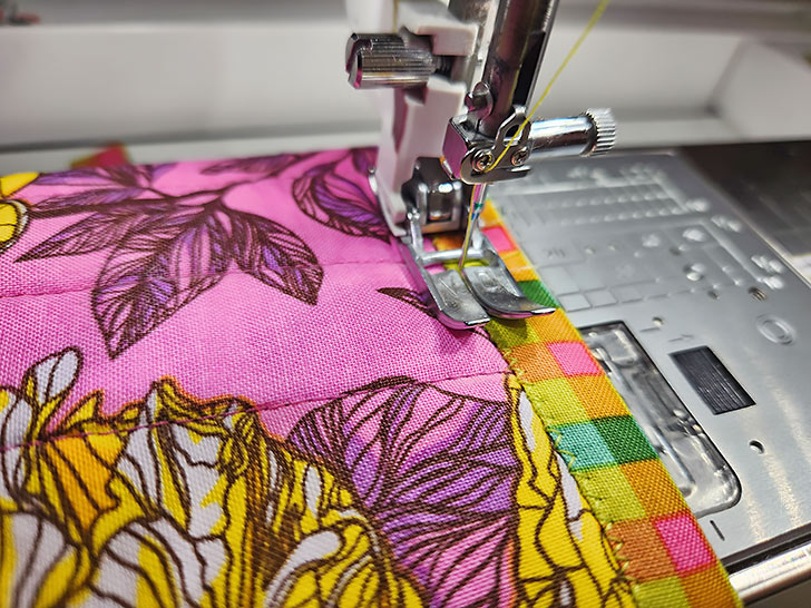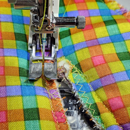 - Re-thread the machine as necessary with a thread color that best blends with all three of your fabrics: front, back, and lining/binding. We used a pale yellow. Set up the machine for a tiny center position zig zag. We used 1.8mm width and 1.0mm length.