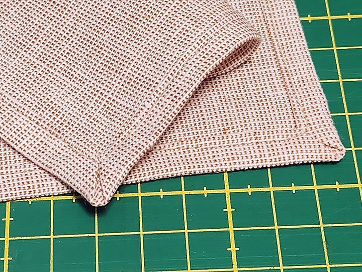 - Press in and stitch a double ¼” hem along each side and across the upper edge of the main linen panel, creating a neat diagonal point at each upper corner. The bottom edge remains raw. Remember to re-thread your machine if necessary with thread to best match your linen in the top and bobbin and to re-set for a slightly lengthened straight stitch. We switched back to a standard presser foot.
