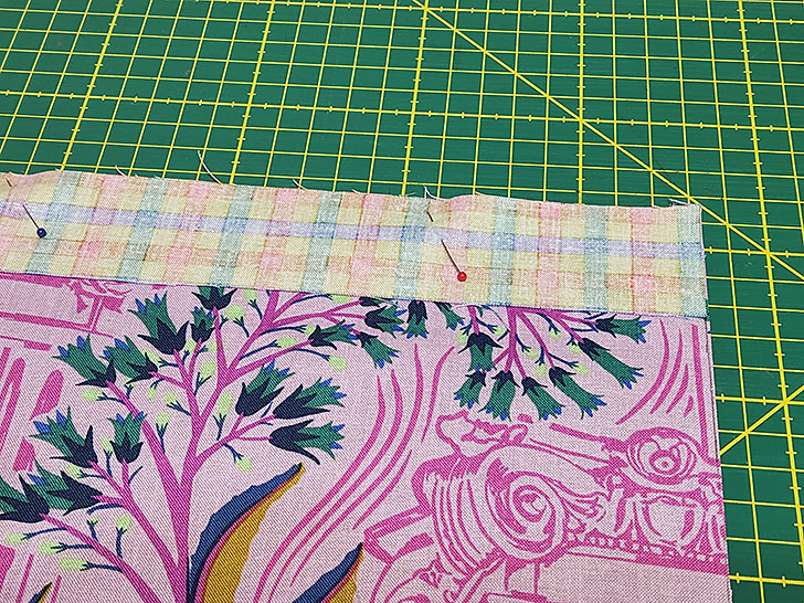 - Place the accent band right sides together along the top raw edge of the accent panel. Pin in place.