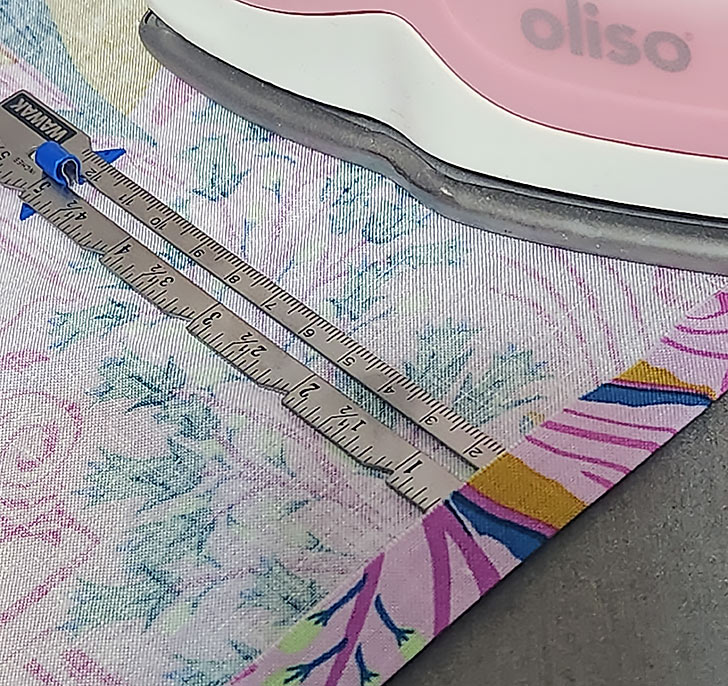 - On the opposite raw edge of the accent panel, fold back the raw edge a skant ½” and press well (skant means just a bit smaller than a full ½” – you can see that tiny difference on the seam gauge in the photo below).