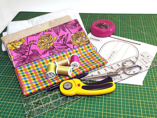 - ¾ yard of 44”+ quilting weight cotton for the front of the mitt and the border of the towel; we originally used two selections from the Our Fair Home Collection by Anna Maria Horner for FreeSpirit Fabrics: Aphrodite in Sugar (the light lilac set) and Housewarming in Shocker (the deep pink set)