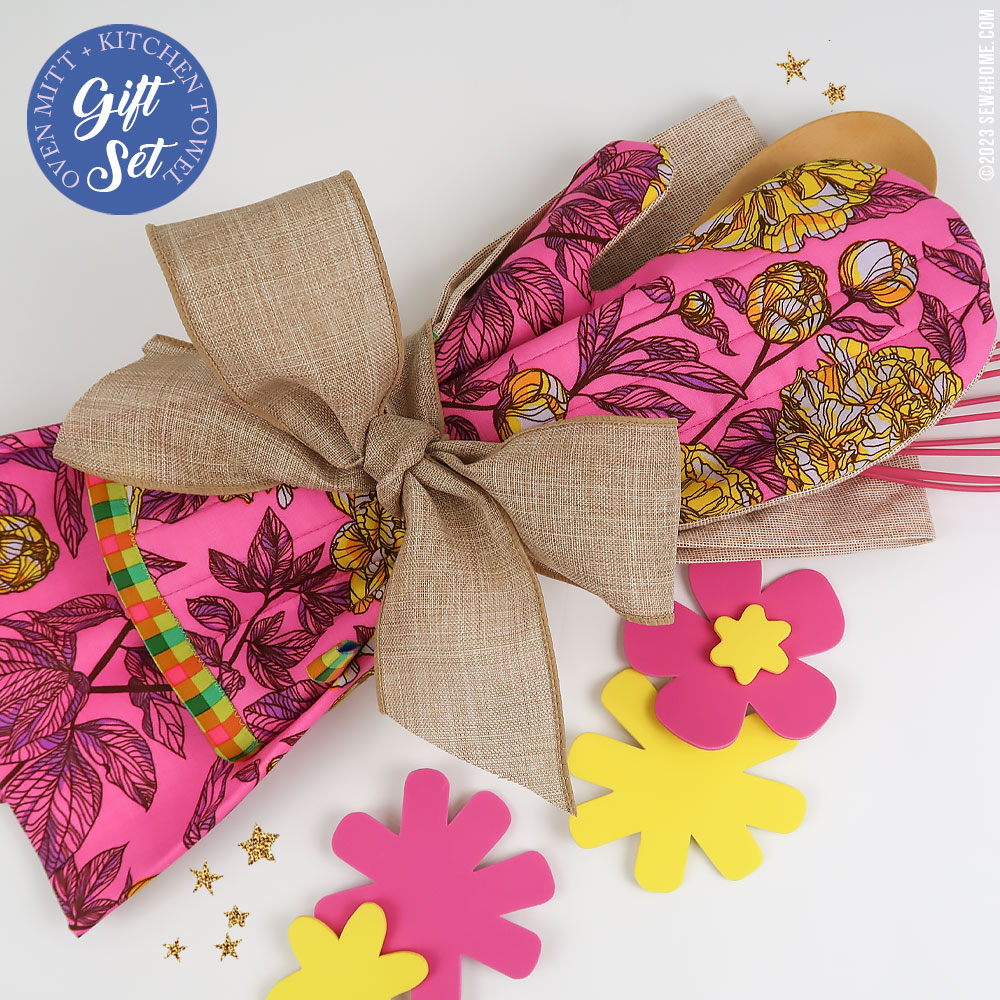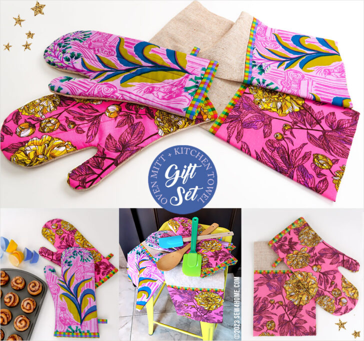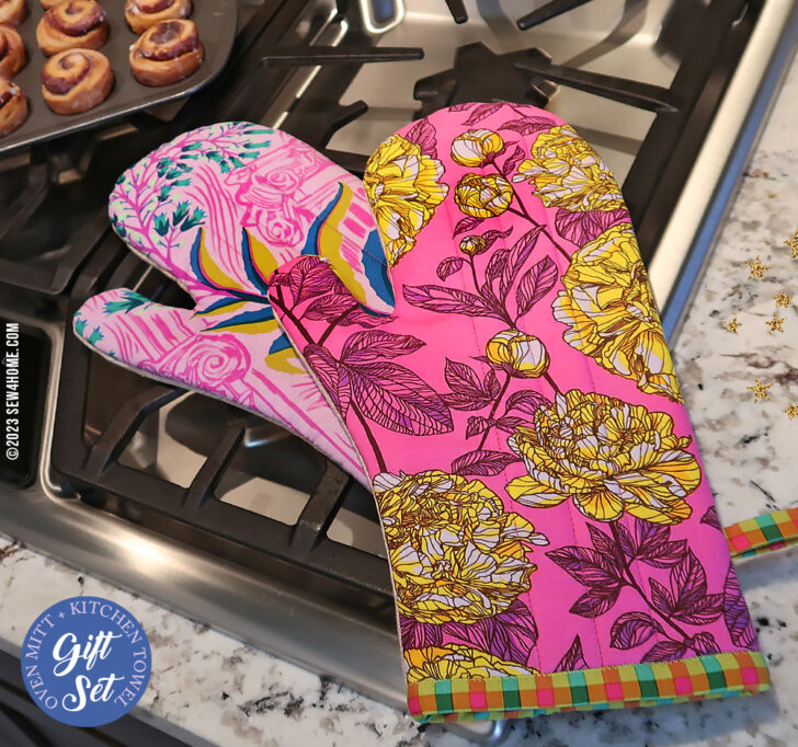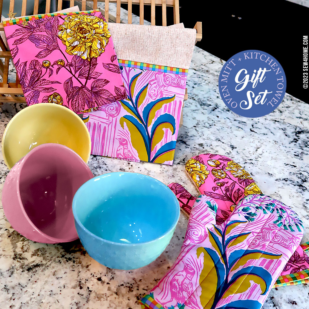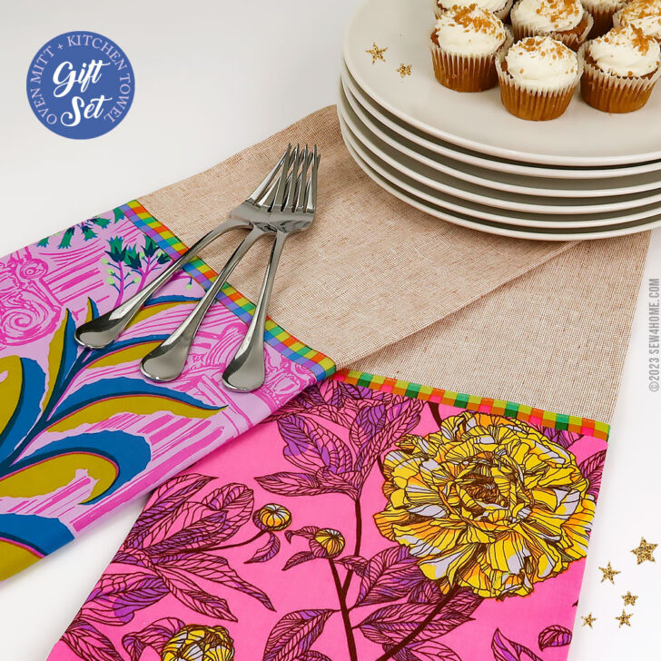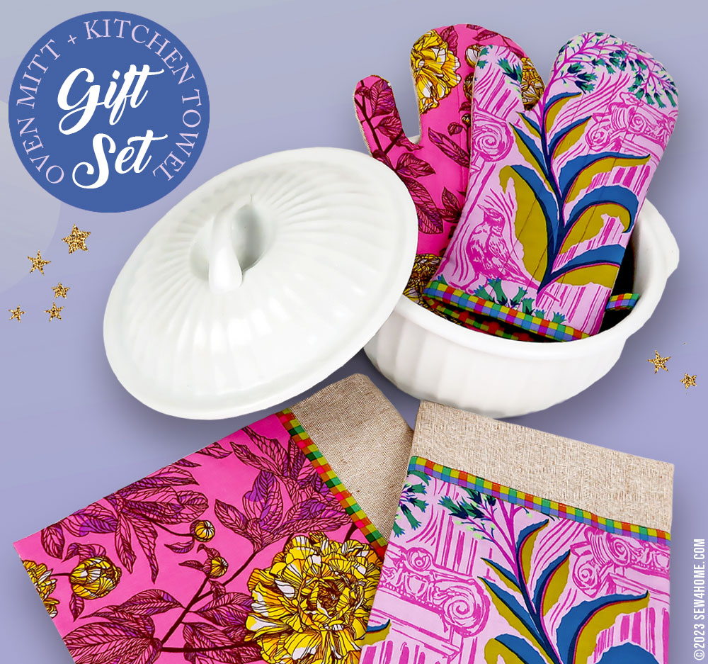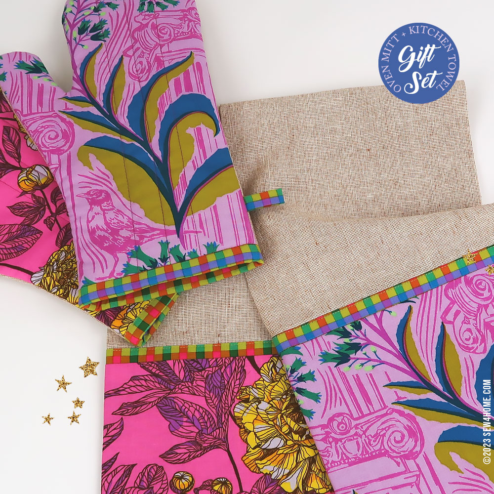 The combination of a homespun linen blend with gorgeous quilting cotton is what gives our gift set instant appeal. The lush printed cotton designs are from the Our Fair Home collection by Anna Maria Horner for FreeSpirit Fabrics. The main fabric choices feature fairly bold motifs; it’s always fun to fussy cut a dramatic motif, and this mitt and towel both offer nice large areas to showcase your look.