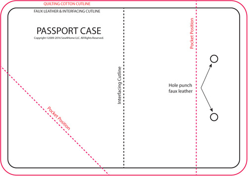 IMPORTANT: Each page of the two-page PDF is ONE 8½” x 11″ sheet. You must print the PDF at 100%. DO NOT SCALE to fit the page. There is a guide rule on the sheets to insure your printout is to scale. Print horizontally (landscape). If possible, print in color in order to use our color coded guide lines. - On the main passport cover base piece, you’ll see two perimeter lines. The outermost line (in red) is the cutting line for the quilting cotton. The innermost line (in black) is the cutting line for the faux leather and the interfacing. To start, cut along the outermost red line.