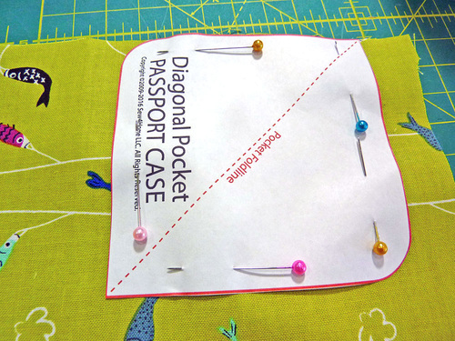 - Also from the quilting cotton, use the full pattern to cut ONE diagonal pocket.