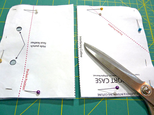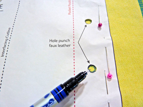 - Punch out and then trace the two circles that indicate the holes for the elastic loop onto the wrong side of the faux leather.
